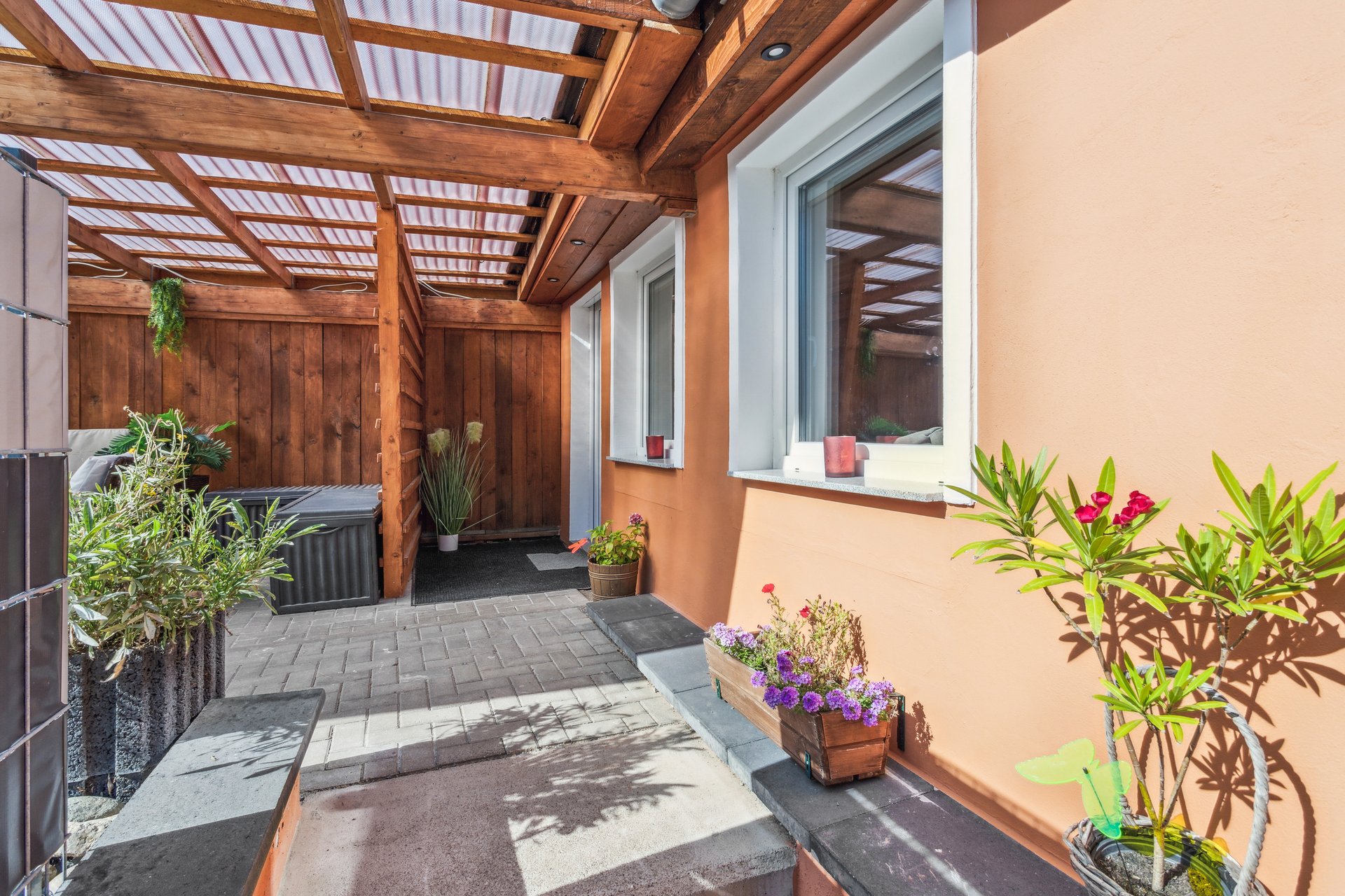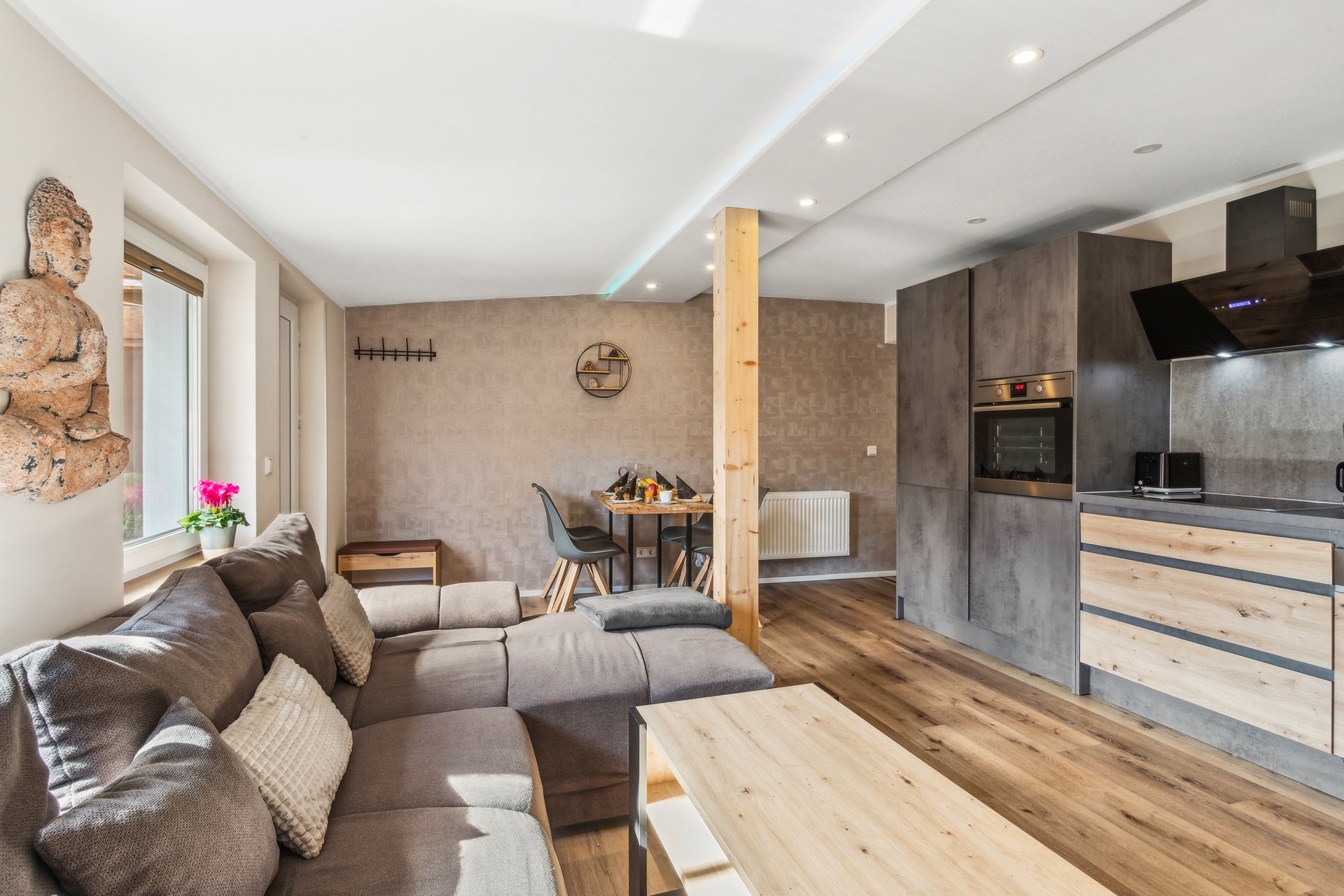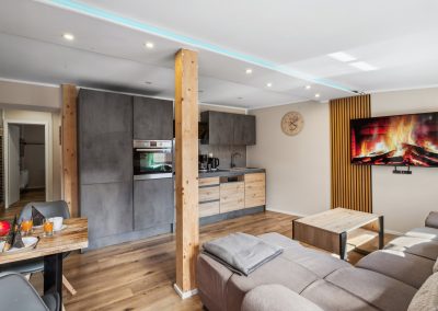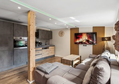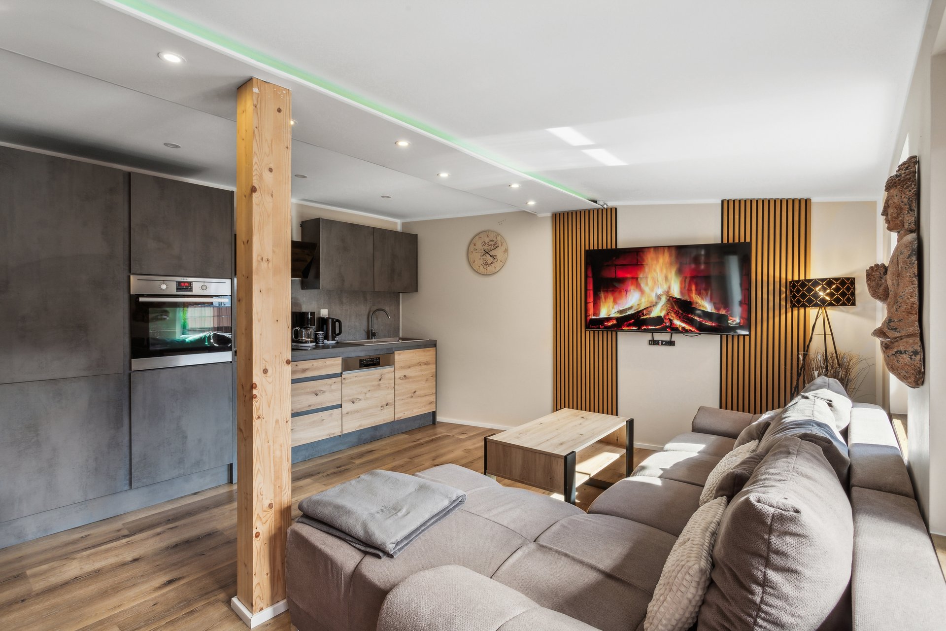 – 🛋 Gemütlicher Wohnbereich – Großzügige Couch und Smart-TV sorgen für entspannte Abende.