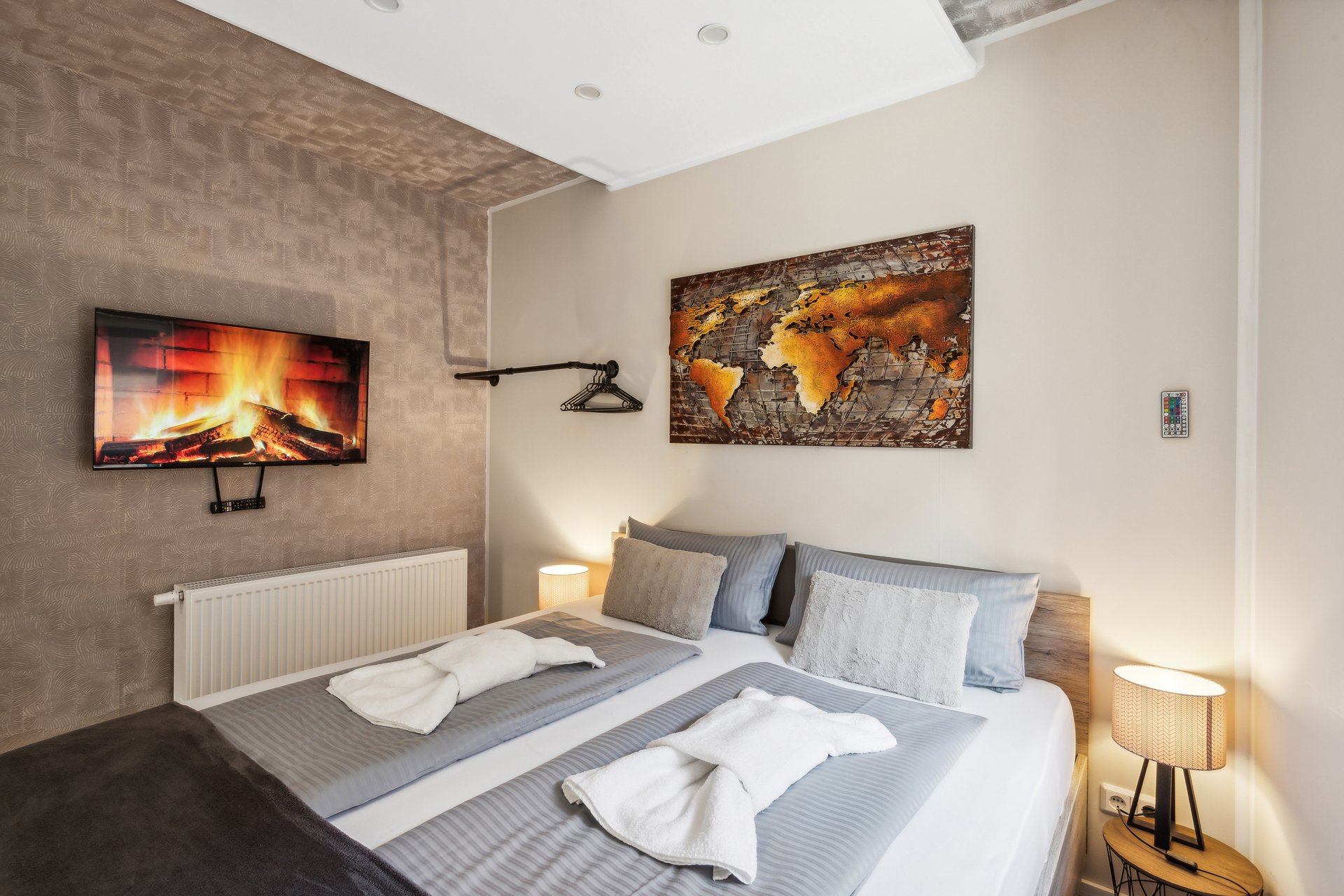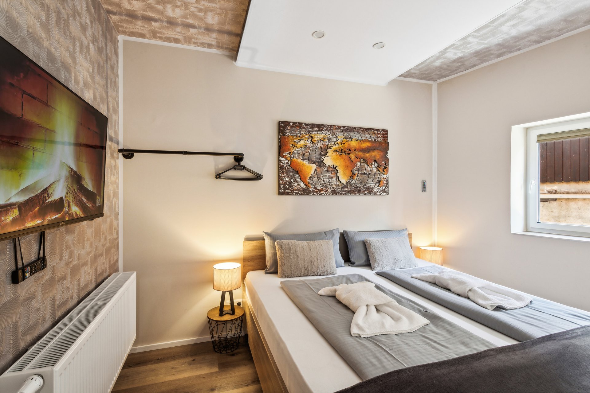– 🛏 Stilvolles Schlafzimmer – Komfortables Bett, stimmungsvolle Beleuchtung und dekorative Details schaffen eine erholsame Atmosphäre.