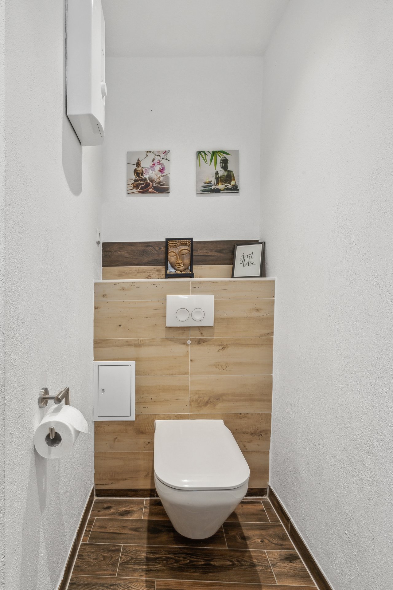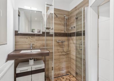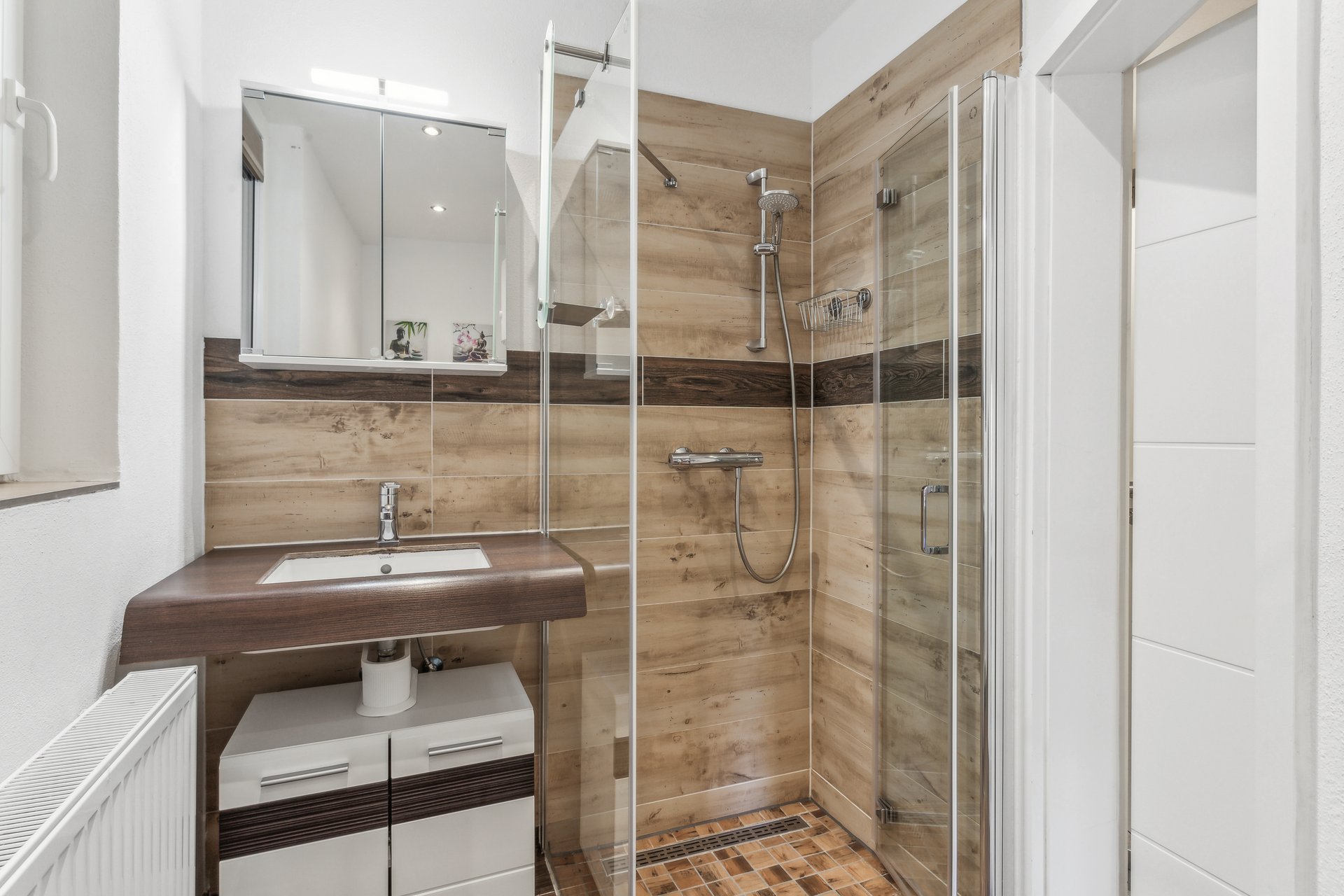 🚿 Modernes Badezimmer – Stilvolle Holzelemente, eine große Dusche und ein Doppelwaschtisch für das gewisse Spa-Feeling.