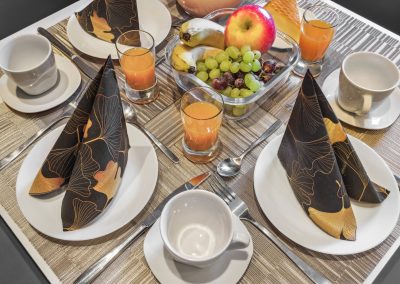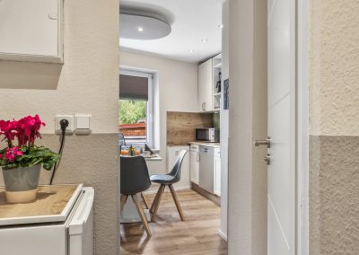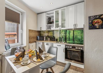 🍳 Komplett ausgestattete Küche – Mit allem, was ihr zum Kochen braucht: Cerankochfeld, Backofen, Mikrowelle, Kaffeemaschine und Geschirrspüler. Das neue Bild zeigt den gemütlichen Frühstücksbereich mit Waldblick-Rückwand – der perfekte Start in den Tag!