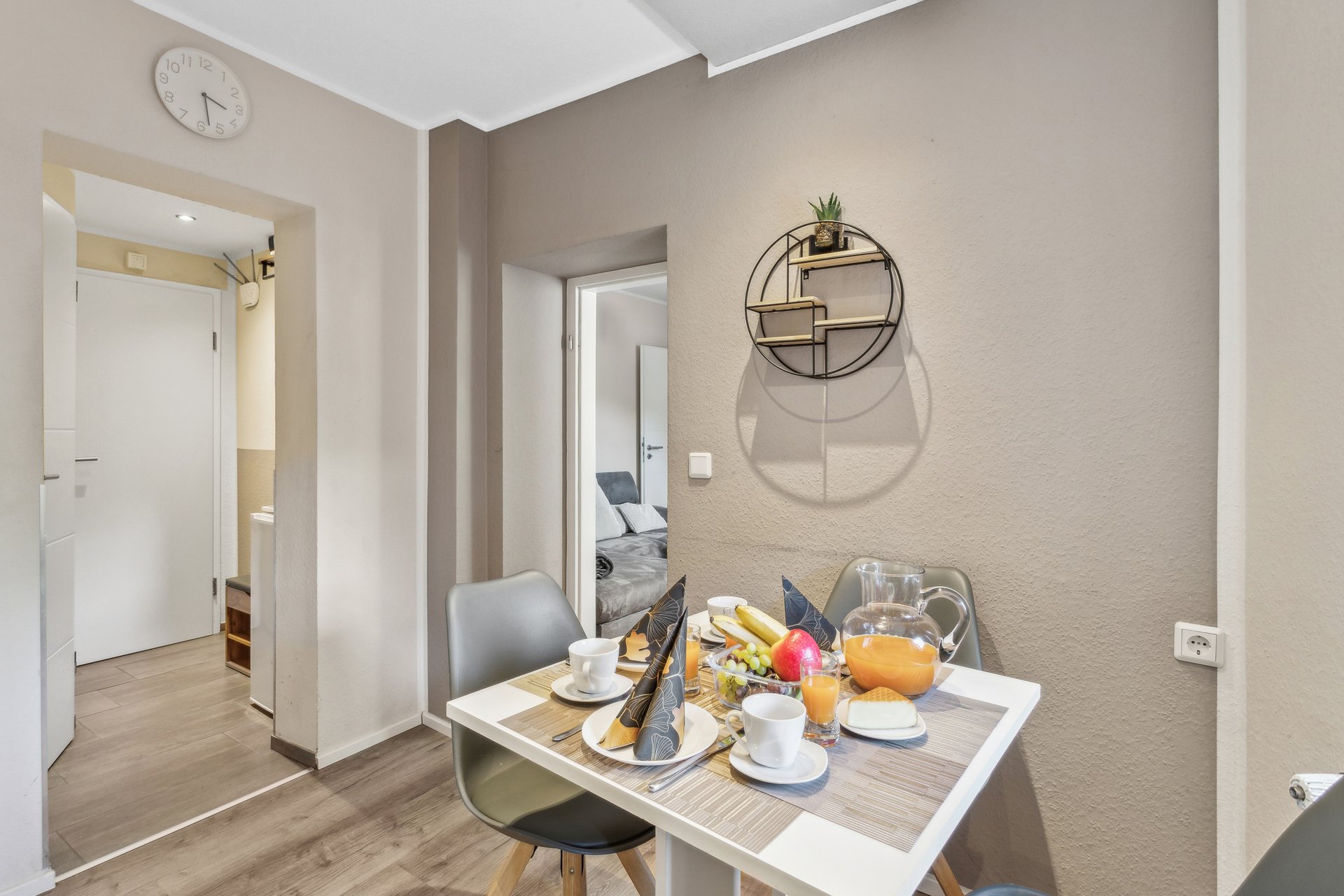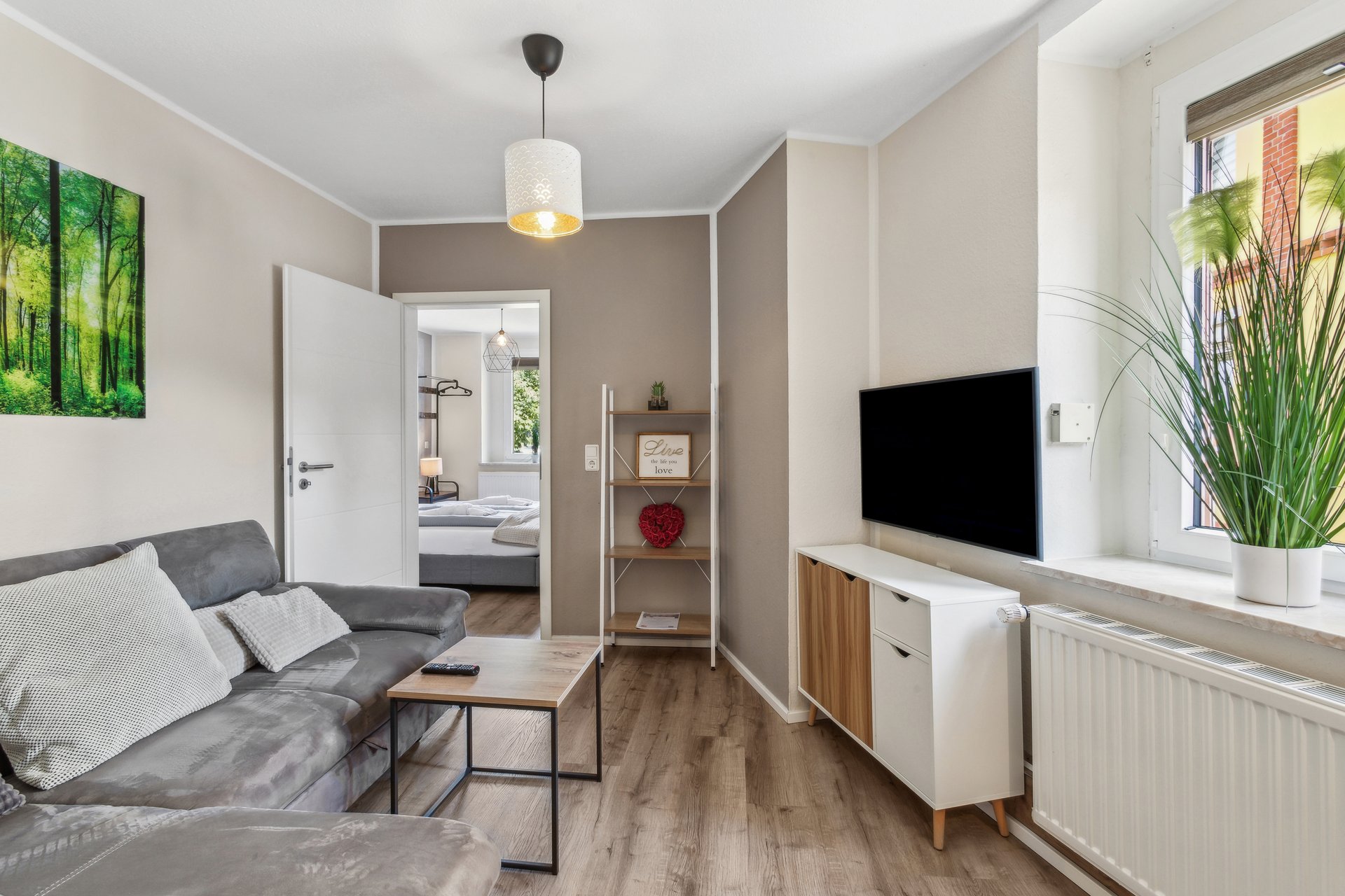 🛋 Entspannter Wohnbereich – Eine große Couch zum Relaxen und ein farbenfrohes Wasserfall-Wandbild sorgen für eine besondere Atmosphäre. Der TV bietet entspannte Filmabende nach einem erlebnisreichen Tag.